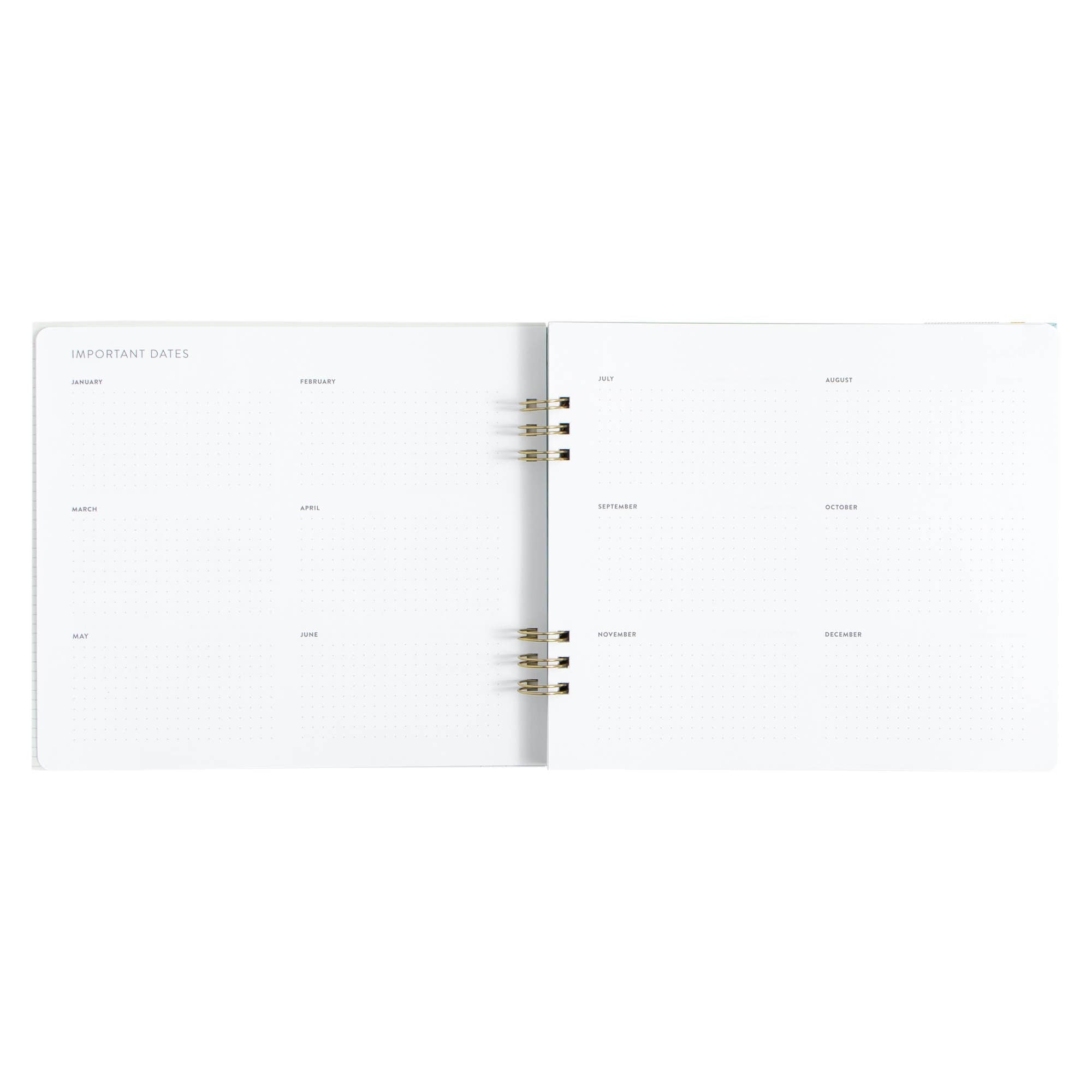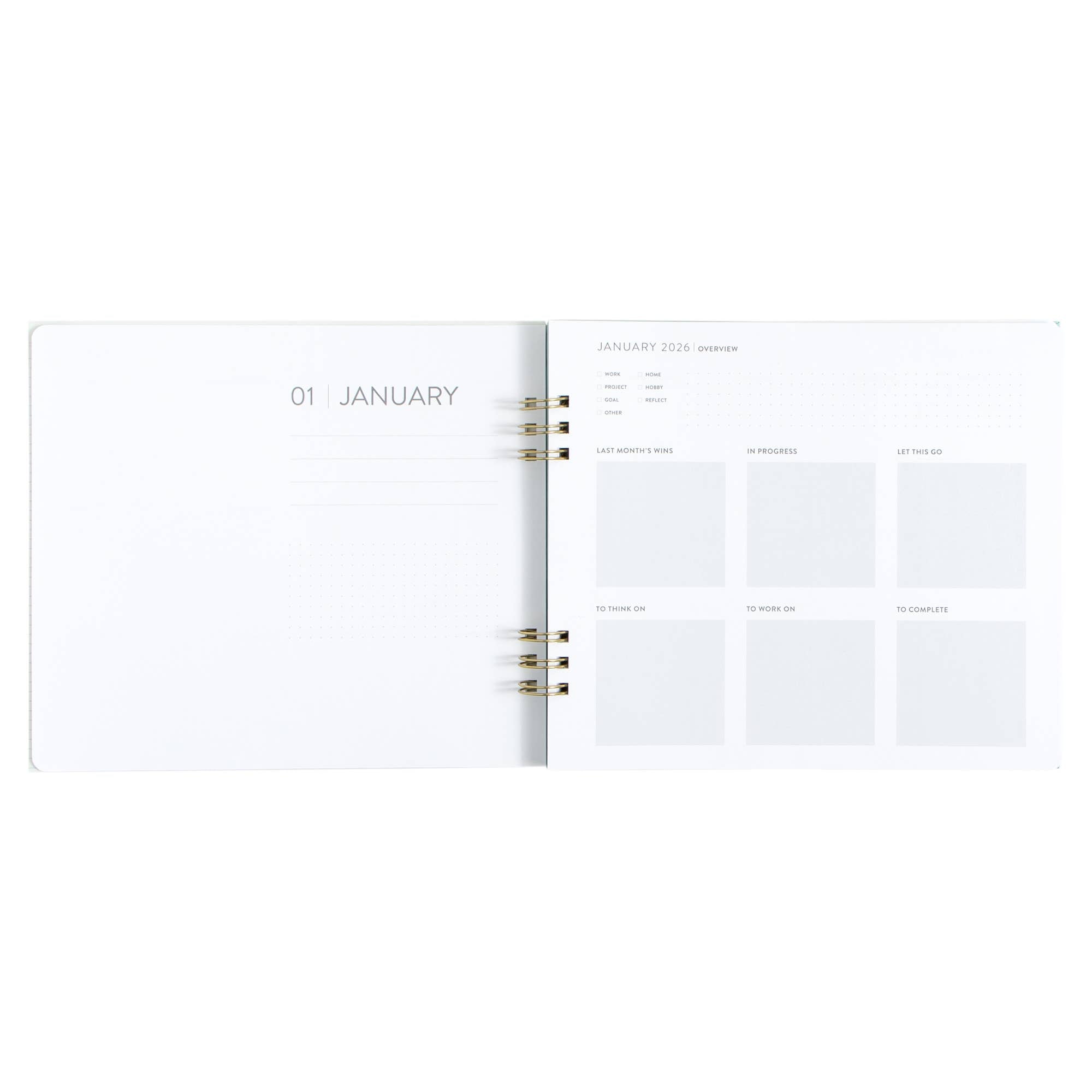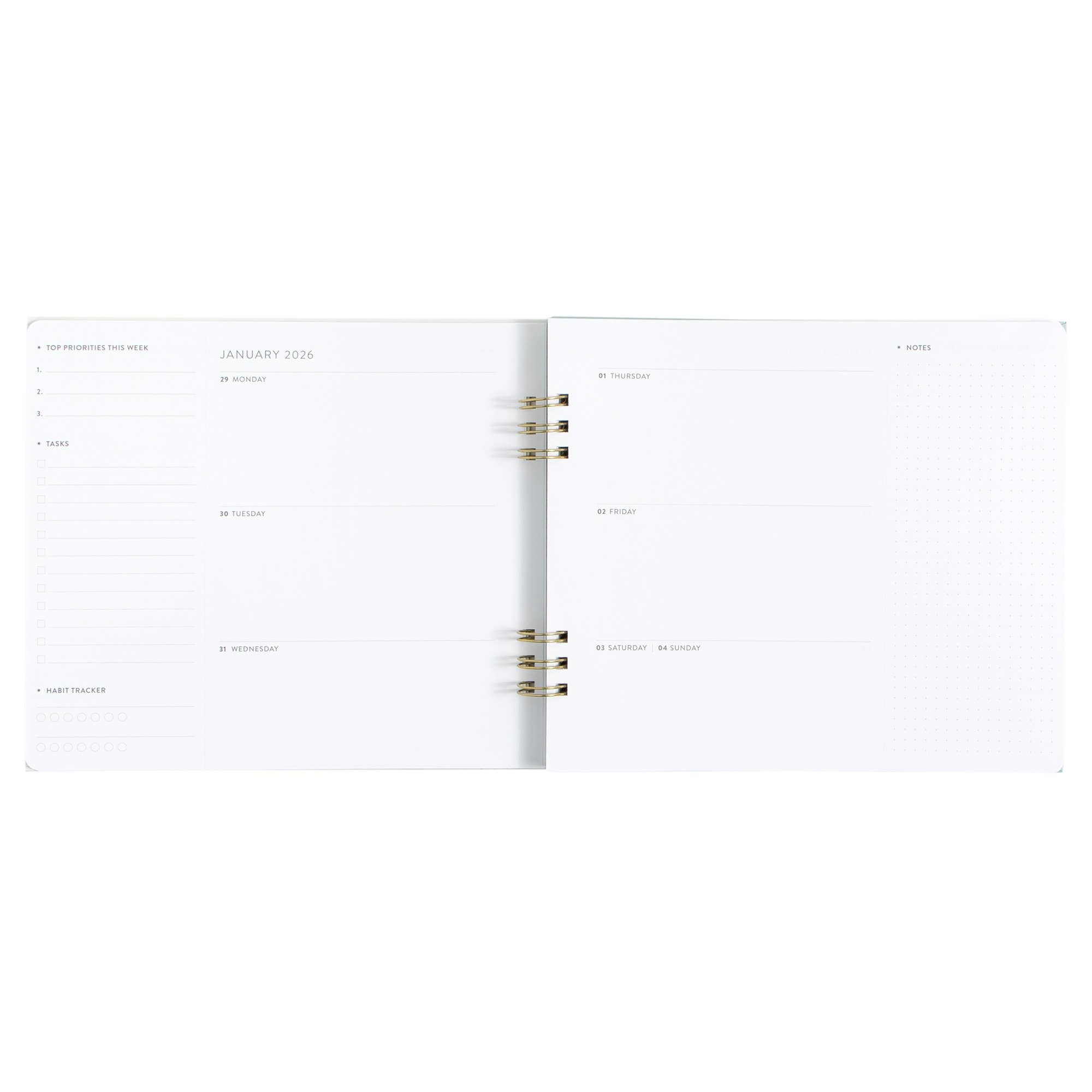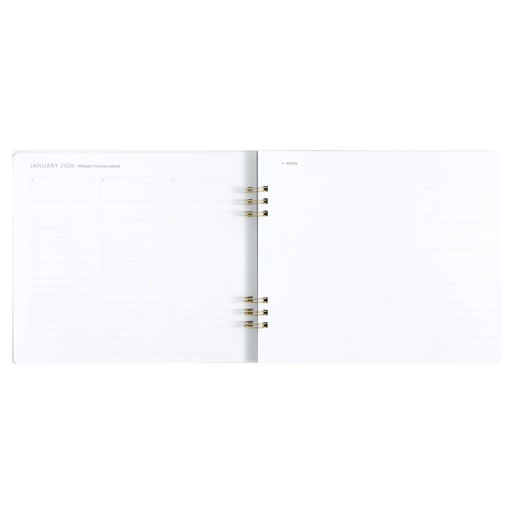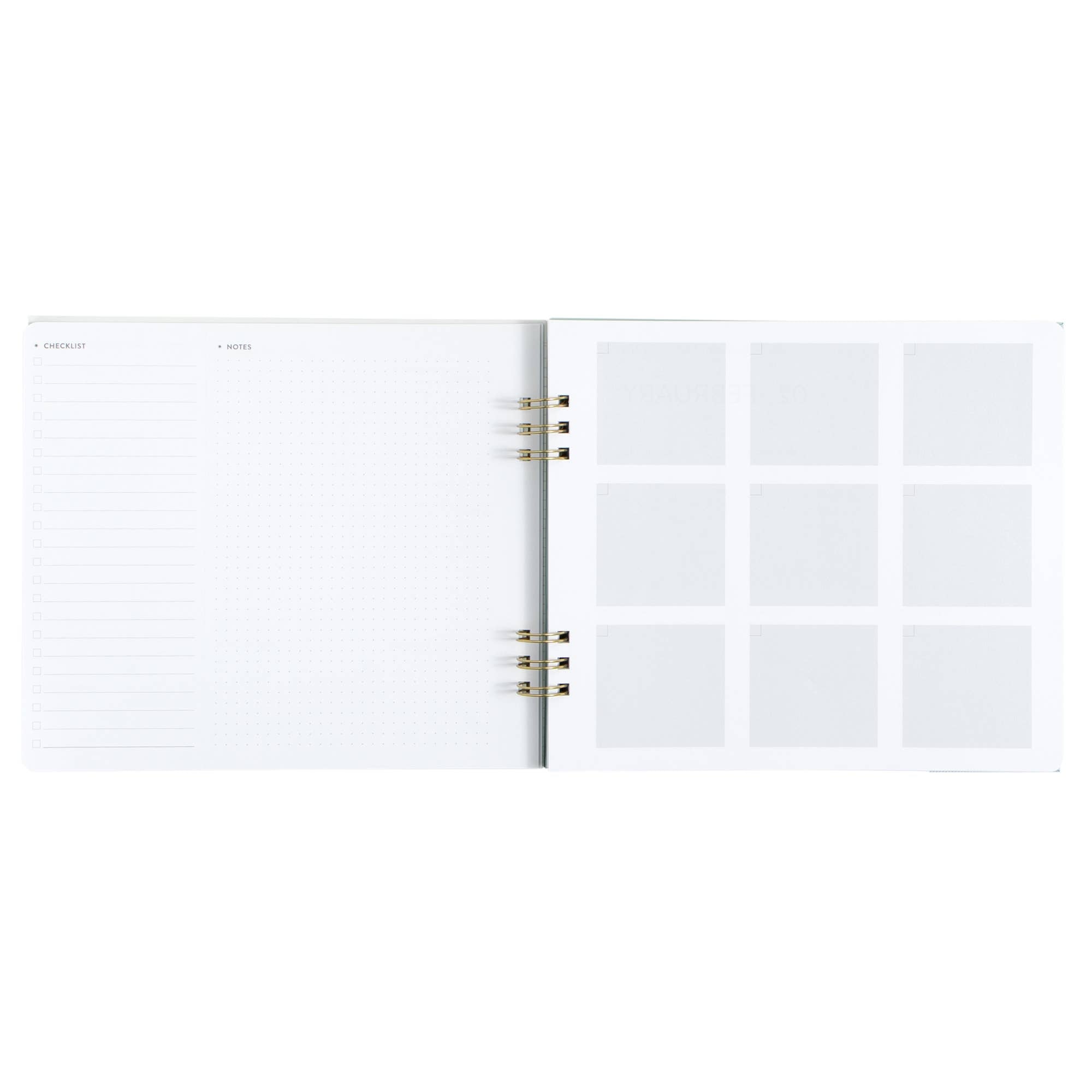 Features: Hard cover, lay flat spiral binding, front and back cover pockets, elastic closure, project planner, monthly and weekly planners, year-at-a-glance view, important dates and goals, perforated notes