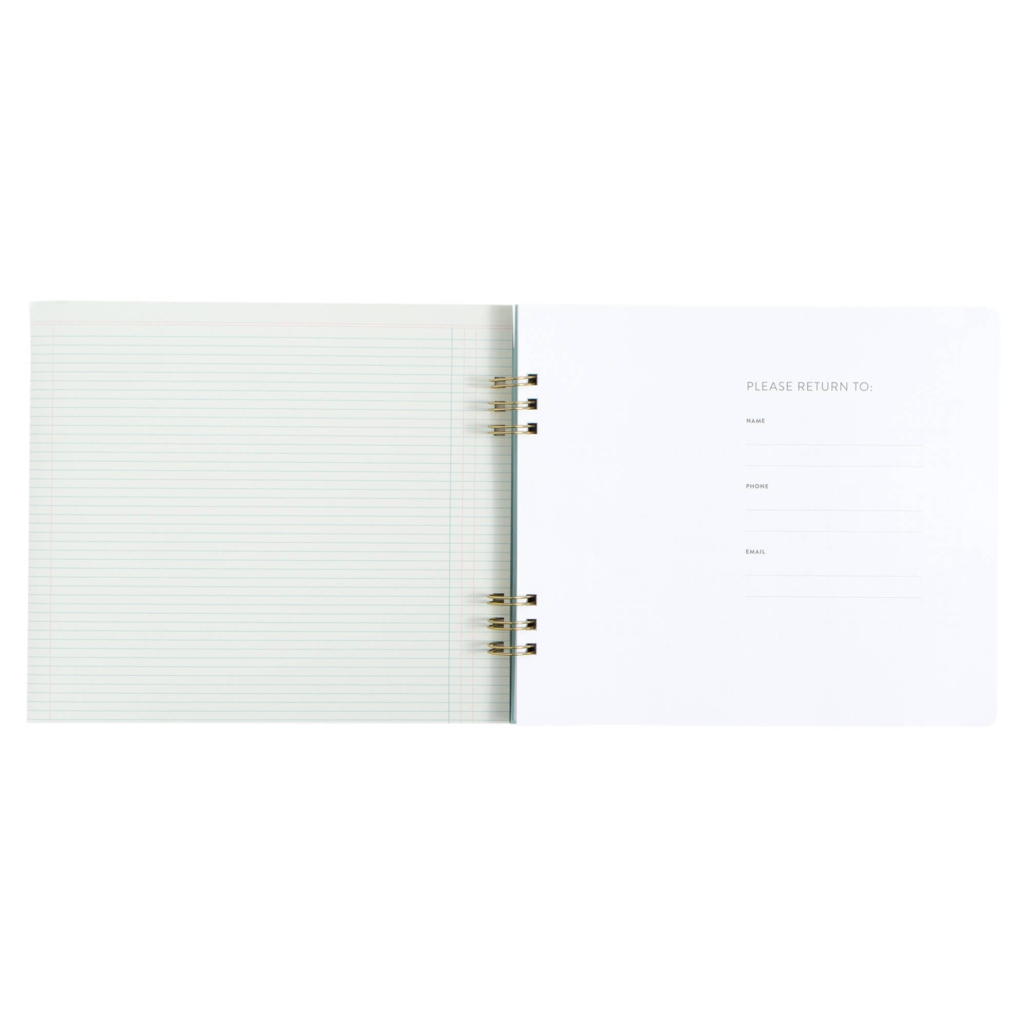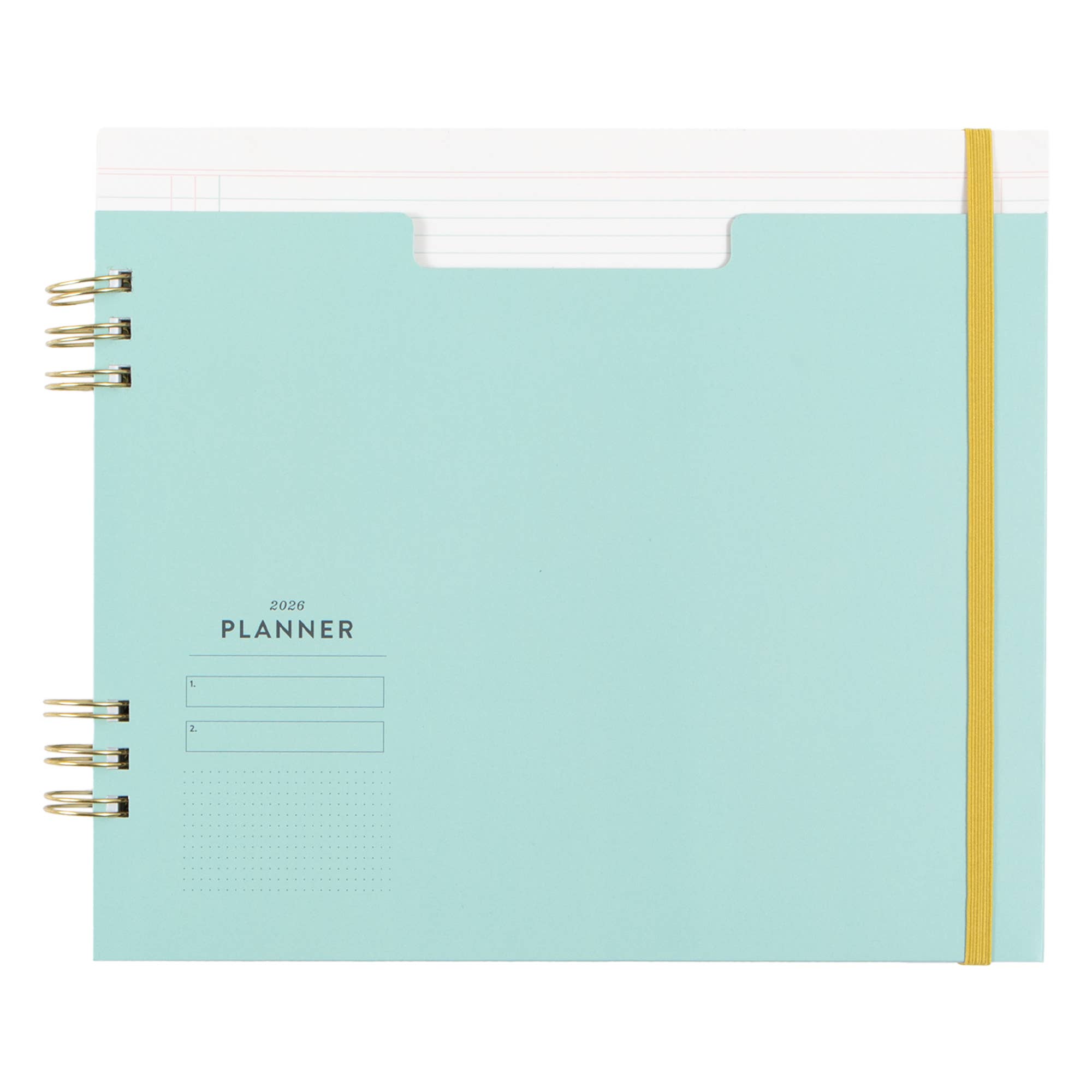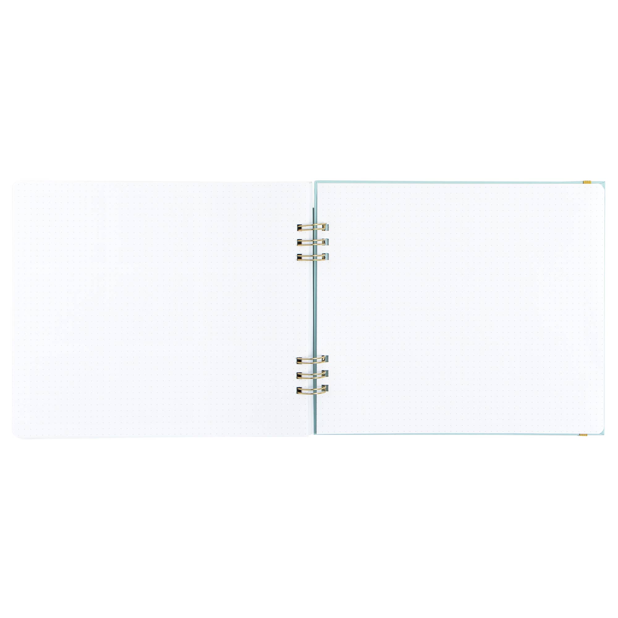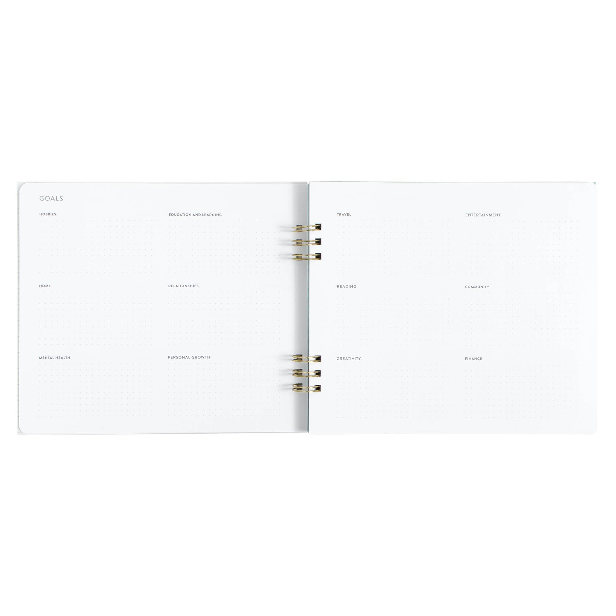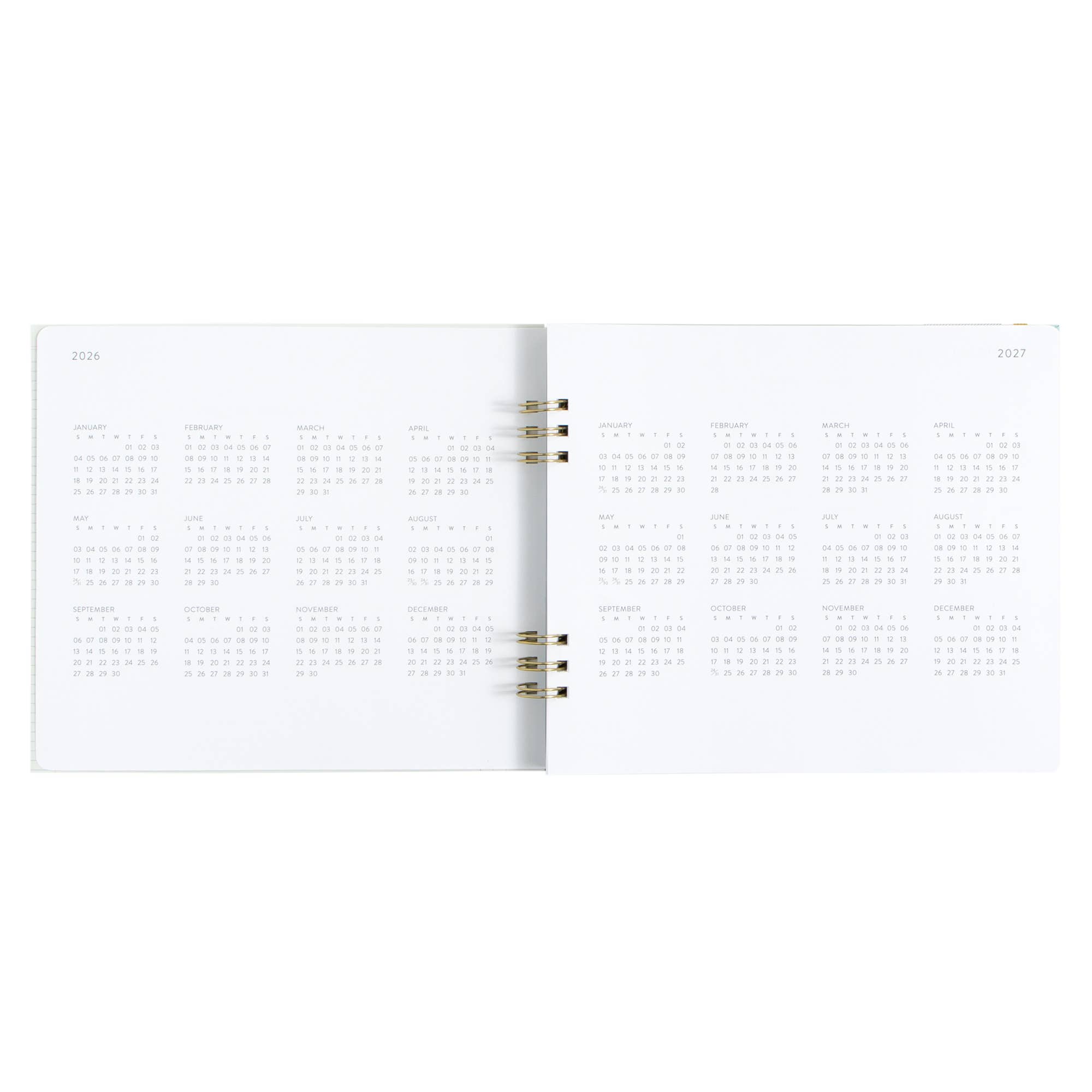 Features: Hard cover, lay flat spiral binding, front and back cover pockets, elastic closure, project planner, monthly and weekly planners, year-at-a-glance view, important dates and goals, perforated notes