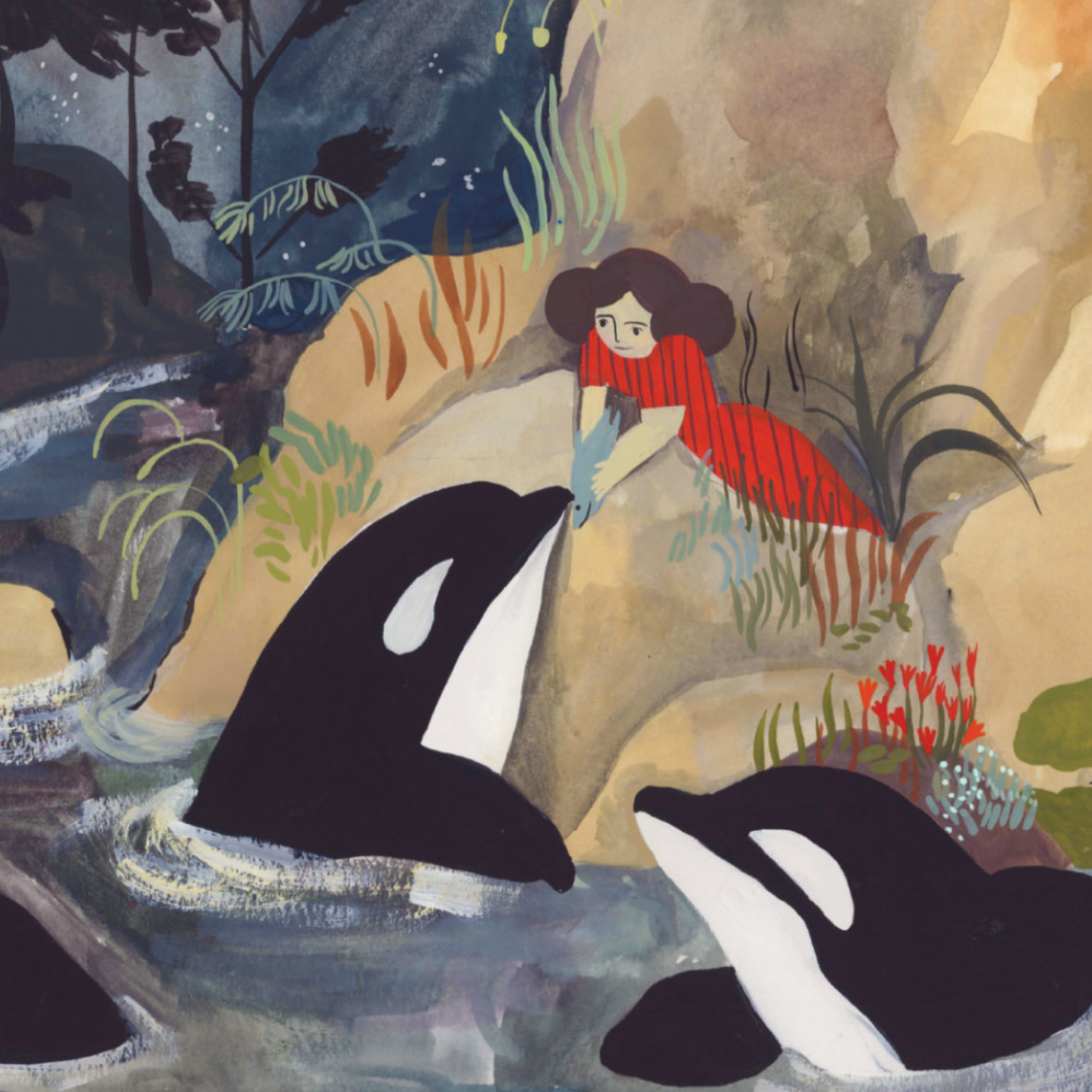 A touching multicolored sympathy card featuring multiple orcas greeting a woman dressed in red sitting shoreside with trees and a full moon in the distance, text reads "Everything Will Be OK."