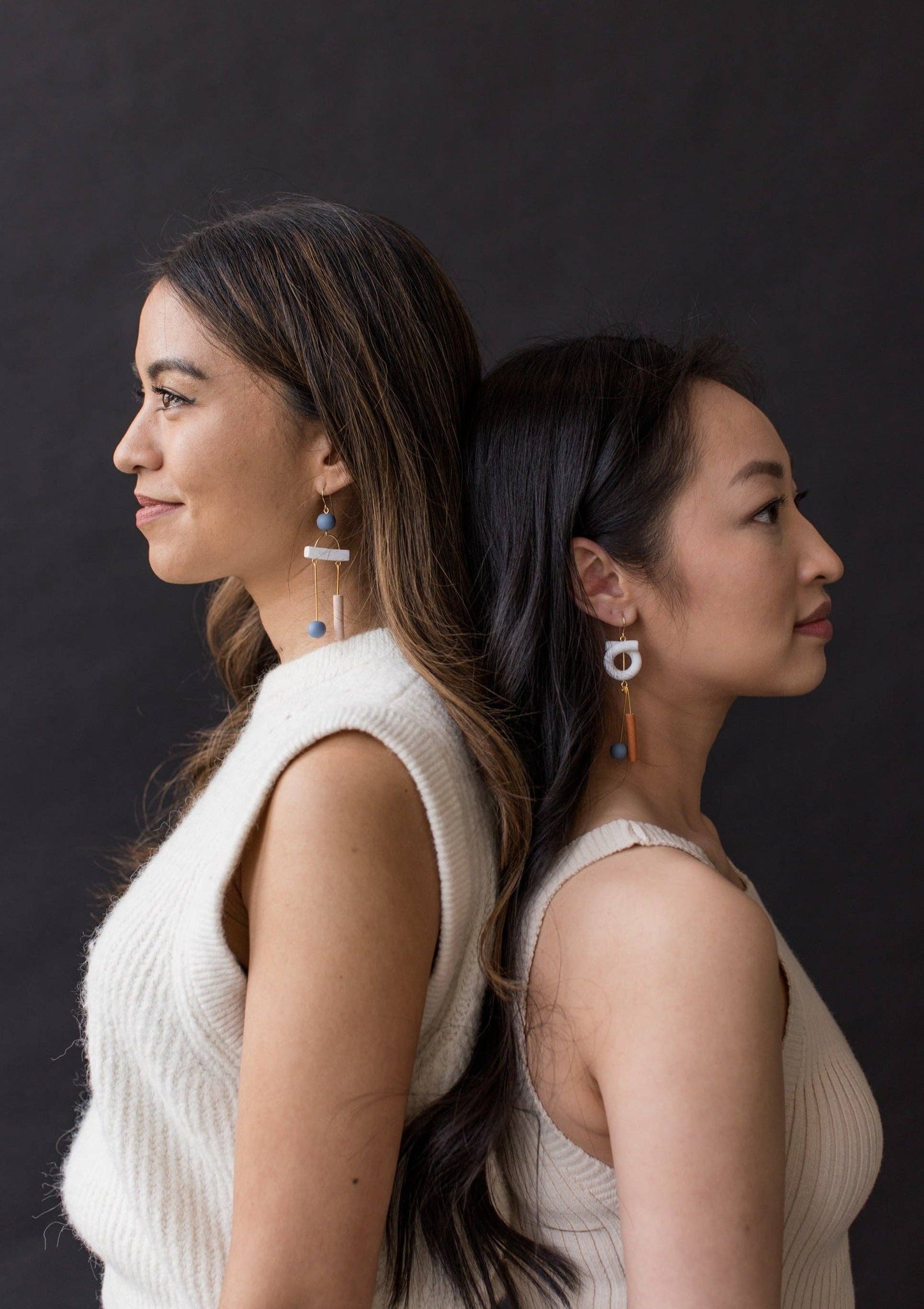 Inspired by the playfulness of modern mobiles, the IMAGINATION earrings are exactly what their name encompasses... a delightful encapsulation of ideas realized! Each of the components of these earrings are hand-formed in a consciously slow made effort. The beads are all made from polymer clay and carefully rolled, one by one, to create perfect balance in the earring. The textures rolled into the clay will often catch the light and provide and unexpected glimmer, just like concrete on a sunny day. Each earrings features a fun, mirrored silhouetted from its partner pair in a complementary colorway.