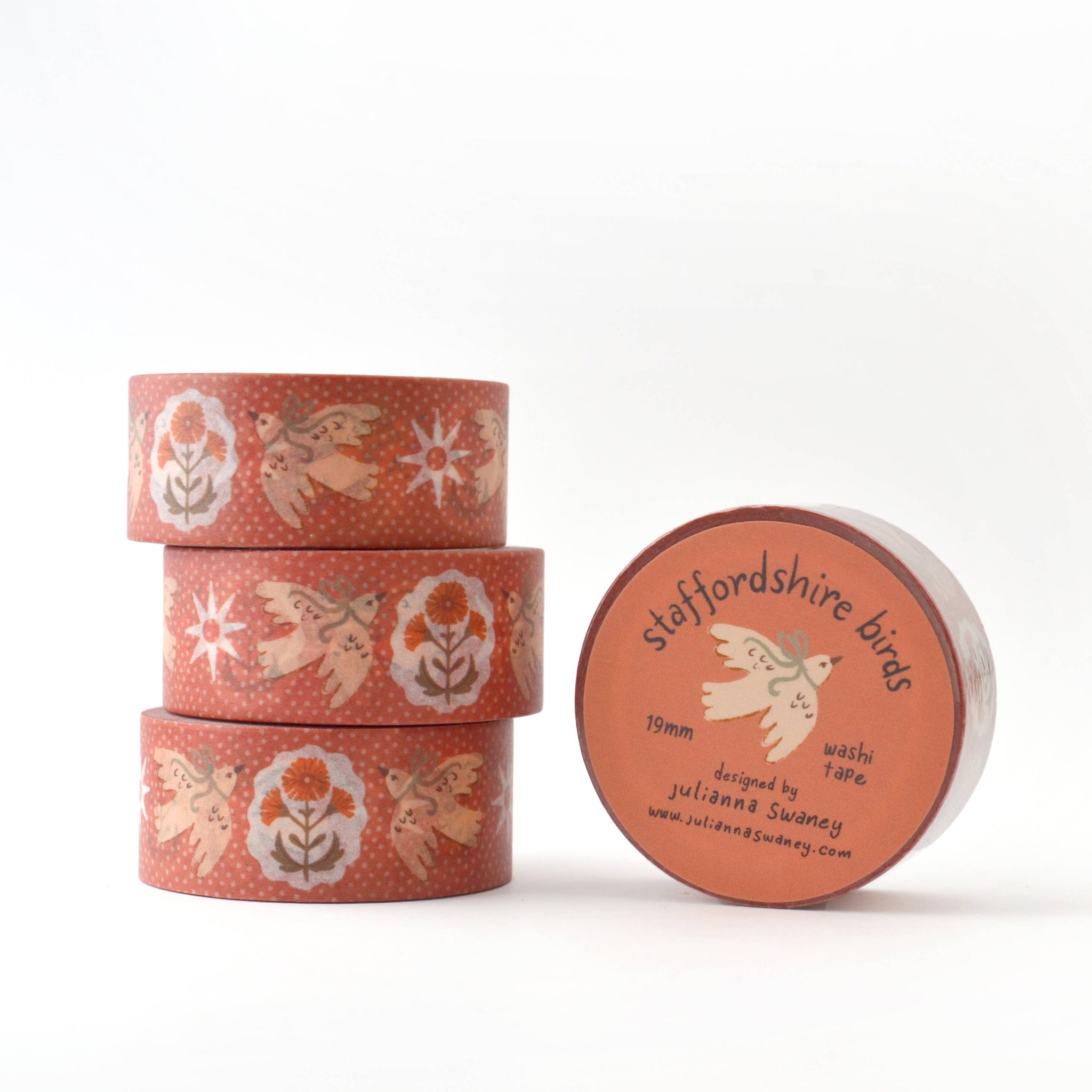 This pretty washi tape is made from original illustrations by Julianna Swaney and it features a sweet pair of birds, and an English textile inspired pattern of flowers, stars and polka dots over a background of dark pink