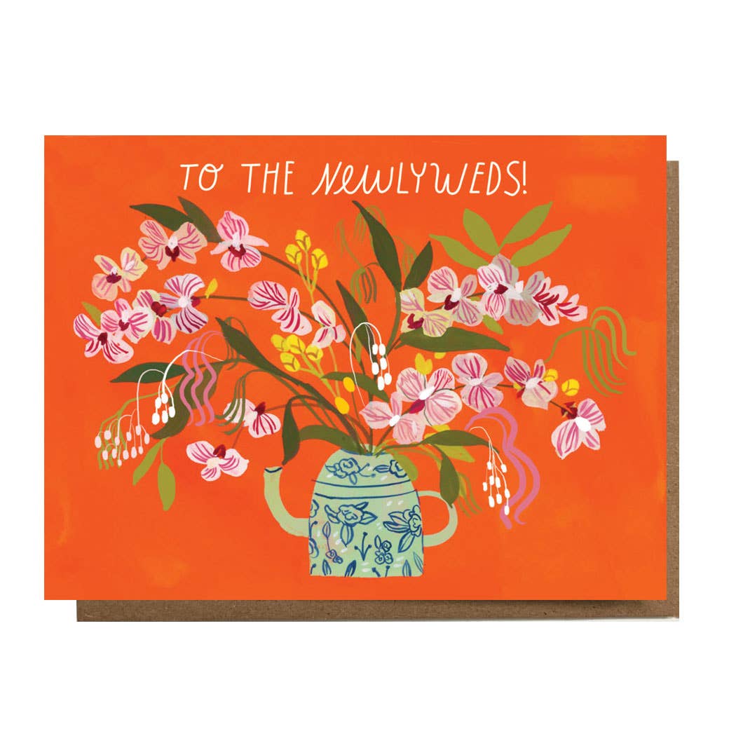 An elegant multicolored greeting card featuring a lovely bouquet of flowers in a water pitcher vase, text reads "To The Newlyweds!"