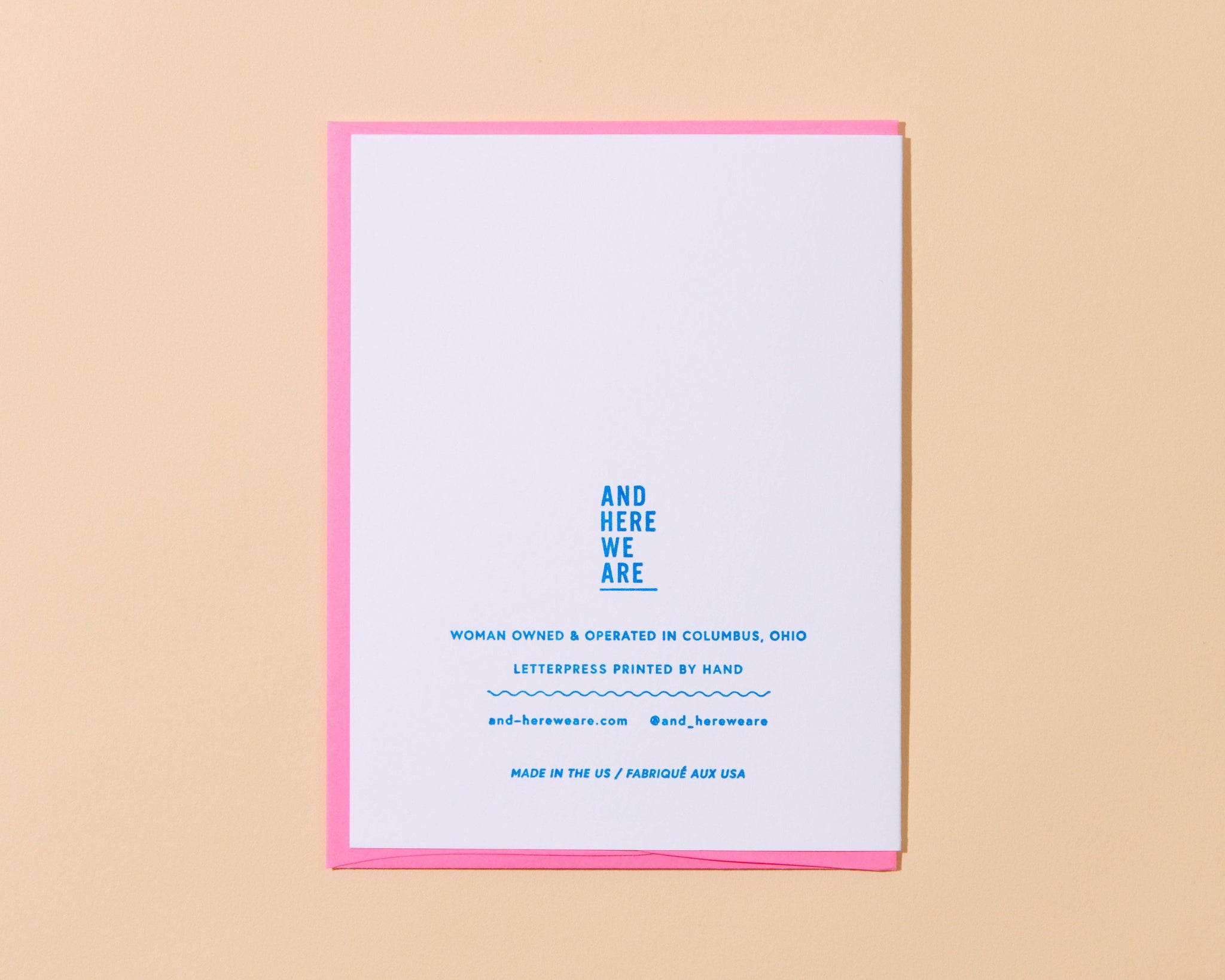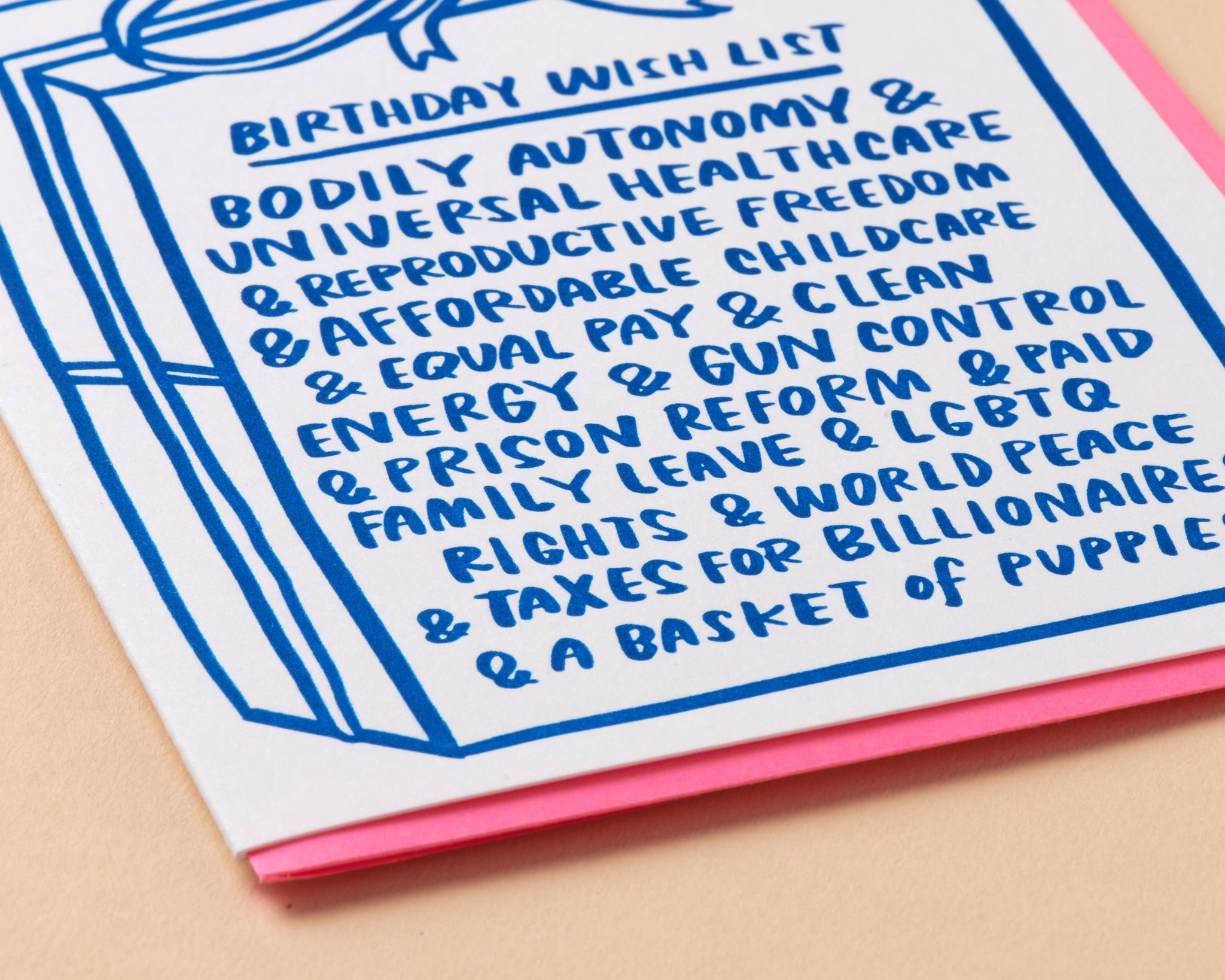 Card reads: "Birthday wishlist - Bodily autonomy & universal healthcare & reproductive freedom & affordable childcare & equal pay & clean energy & g*n control & prison reform & prison reform & paid family leave & LGBTQ rights & world peace & taxes for billionaires & a basket of puppies
